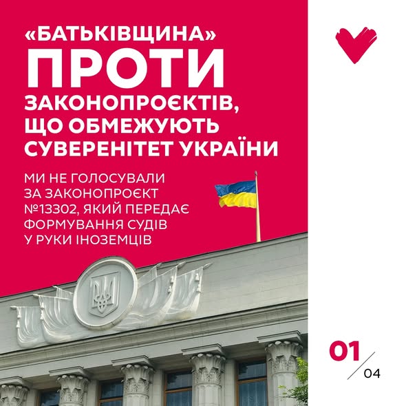 «Батьківщина» не підтримала законопроєкт №13302, який передає формування судів у руки іноземців. Ми проти будь-яких ініціатив, що обмежують суверенітет України.