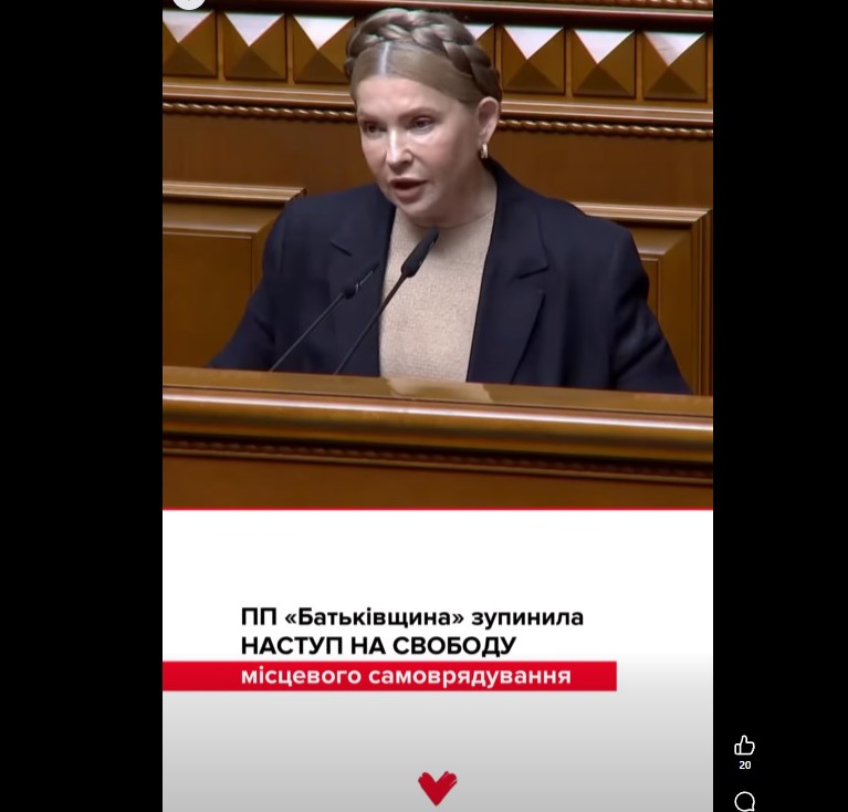 Лідерка «Батьківщини» закликала депутатів не підтримувати законопроєкт, бо його ухвалення загрожувало б самостійності місцевих громад та європейському курсу України.