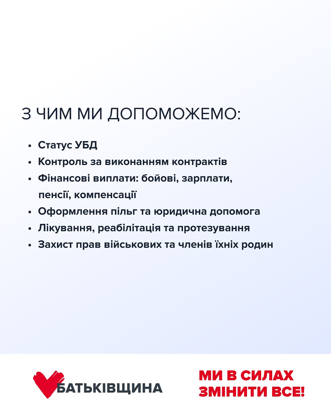 Ми допоможемо з юридичними питаннями, виплатами, лікуванням, статусом УБД та правами військових і їхніх родин.